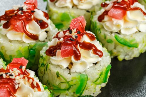 Японский омлет и салат Хияши Вакаме придают текстуру, тунец и сливочный сыр – гармоничный вкус, ореховый соус и кунжут-микс – изысканность. Итоговый внешний вид может отличаться от фотографий на сайте.