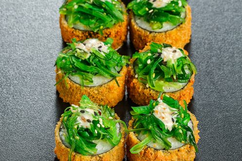 Японский омлет, салат Хияши Вакаме, ореховый соус, сливочный сыр. итоговый внешний вид может отличаться от фотографий на сайте