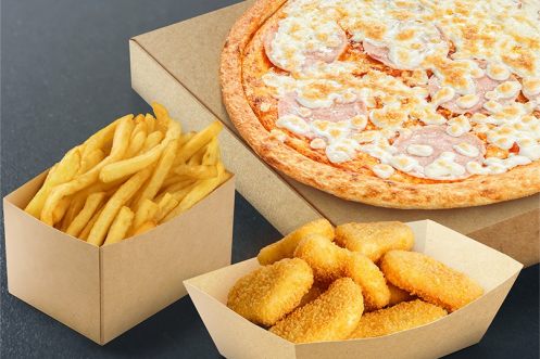 Куриные наггетсы, картофель фри, пицца ветчина и сыр 32 см. *Данный Комбо набор в акциях и скидках не участвует. Итоговый внешний вид может отличаться от фотографий на сайте.